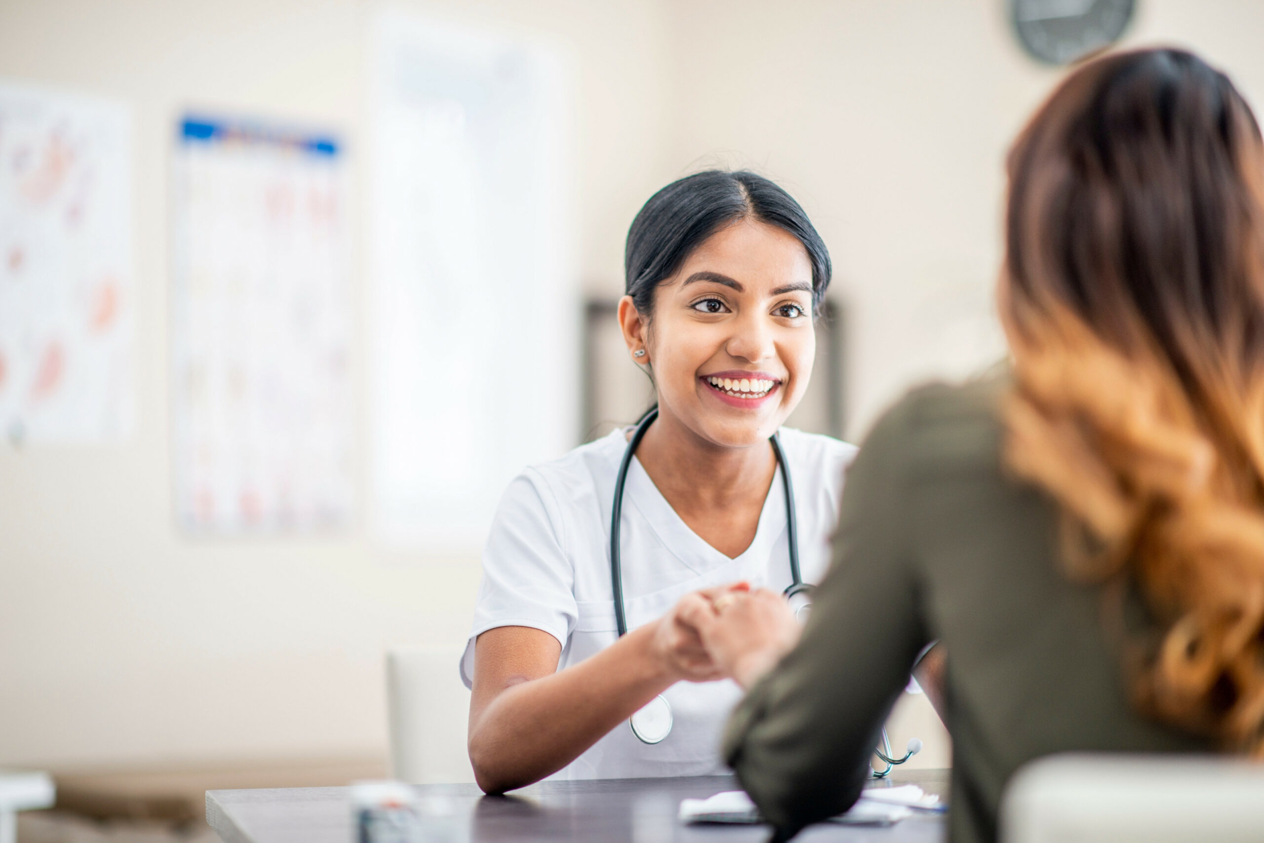 Happy patient speaking with a reassuring doctor.
